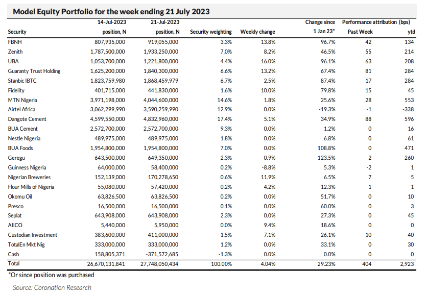 Last week the Model Equity Portfolio rose by 4.04% compared with a rise in the NGX All-Share Index of 3.89%, outperforming it by 15bps. Year-to-date it has risen by 29.23% compared with a rise of 26.83% in the NGX All-Share Index, outperforming it by 240bps.