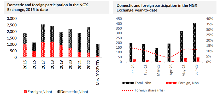 What about equities? Foreign participation in the Nigerian equity markets used to run at high levels, sometimes accounting for 50% of turnover (see 2015). But that was long ago. Successive years of negative equity market performance (2014, 2015 & 2016, followed by 2018 & 2019) were discouraging, to say the least. Problems with repatriation of dividends and principal, notably in 2016 and again in 2020, were also off-putting. Even through the NGX Exchange All-Share Index recorded three straight years of positive returns in 2020, 2021 & 2022, the share of foreign investors in trading fell during this period.