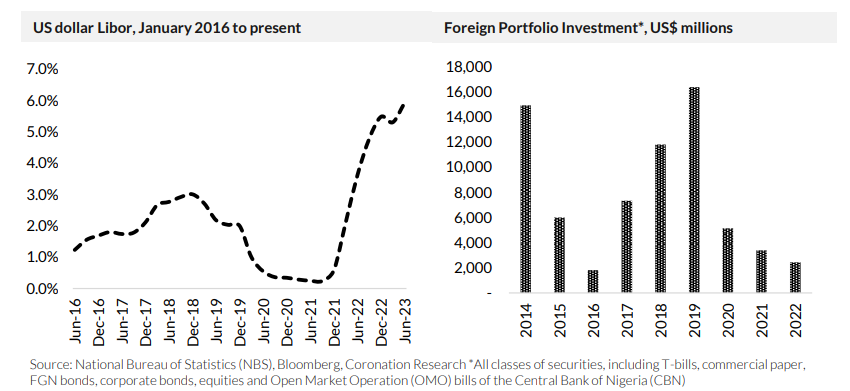 Foreign portfolio investment in Nigeria declined steeply after 2019 as risk-free yields on Nigerian Treasury Bills declined. That happened as the Covid-19 pandemic was about to sweep around the world, disrupting economies and depressing oil prices which, in turn, caused the Central Bank of Nigeria (CBN) to lessen its hitherto generous supplies of US dollars to the foreign exchange markets (from April 2020 onwards), causing the parallel market exchange rate to break away significantly from the official Naira/US dollar rate. These were dark days for foreign investors, especially those attempting to repatriate dividends, coupons or principal investments.