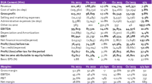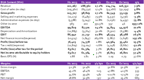 In its recently released H1 2023 results, BUA Cement reported a 17.2% y/y Revenue growth to N221.07bn in H1 2023 from N188.56bn in the prior period (H1 2022). Similarly, on a q/q basis, Revenue was up by 7.9% to N114.71bn in Q2 2023 from N106.35bn in Q1 2023. While no information has been provided on the Revenue breakdown, we attribute the company’s top line growth to increases in both price and volume.