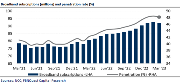 We see from the data that total broadband connections declined by -1% m/m but increased by +14% y/y to about 92 million as at end-Mar ’23.