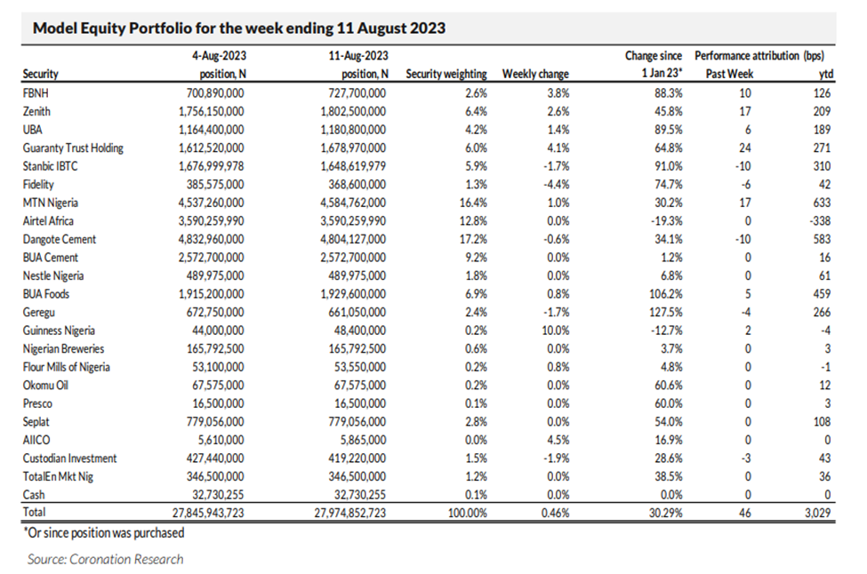 Last week the Model Equity Portfolio rose by 0.46% compared with a rise in the NGX All-Share Index of 0.20%, outperforming it by 26bps. Year-to-date it has risen by 30.29% compared with a rise of 27.46% in the NGX All-Share Index, outperforming it by 283bps.