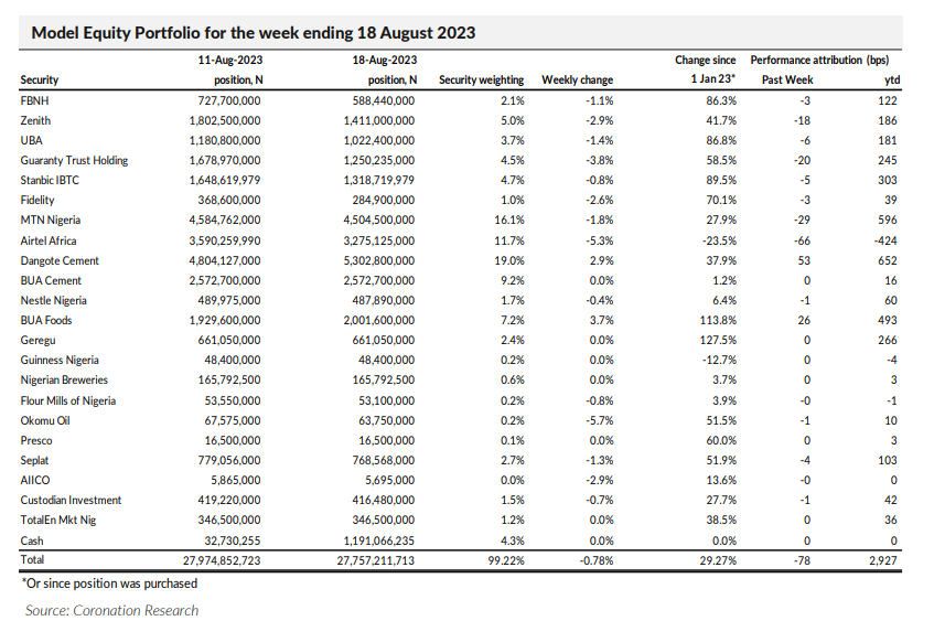 Last week the Model Equity Portfolio fell by 0.78% compared with a fall in the NGX All-Share Index of 0.89%, outperforming it by 11bps. Year-to-date it has risen by 29.27% compared with a rise of 26.33% in the NGX All-Share Index, outperforming it by 294bps.