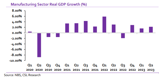 The manufacturing sector grew modestly by 2.45% in 2022, reflecting the negative impact of CBN’s hawkish rendition, especially in the second half of the year. In fact, the sector contracted by 1.91% in Q3 2022, the first contraction since covid hit in 2020. Though at a slower pace, the CBN has maintained its hawkish stance and the fortunes of the sector appeared to have worsened with the latest reforms of the new administration such as the fuel subsidy removal and the unification of the exchange rates at the various windows Though the sector’s growth rate improved slightly to 2.2% compared with 1.61% in Q1 2023, we believe conditions will worsen in H2.