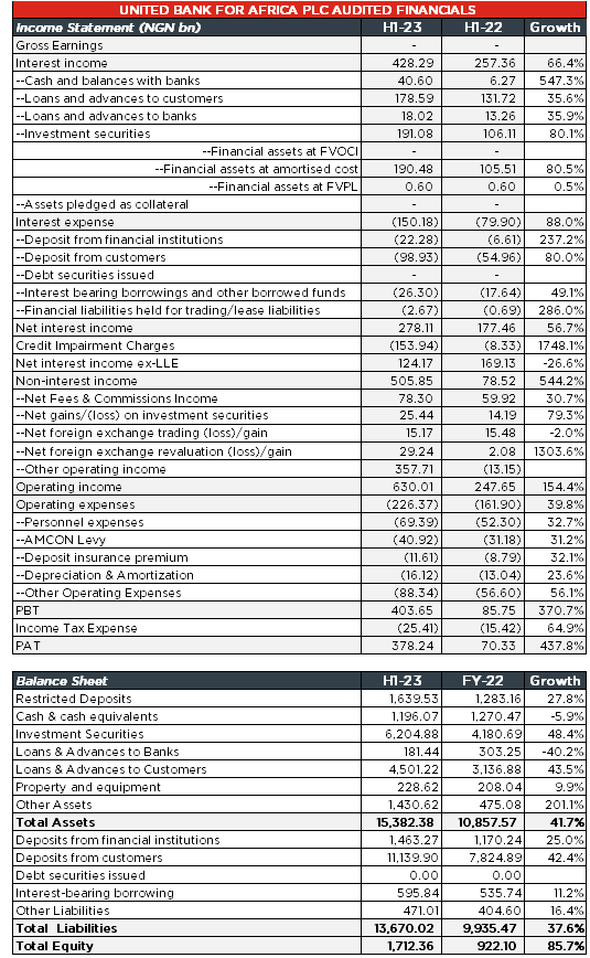 United Bank for Africa Plc (UBA) released its H1-23 audited financials after trading yesterday, showing a significant growth in EPS (+453.0% y/y) to NGN10.95/s (H1-22: NGN1.98/s). This impressive financial performance was supported majorly by the sturdy growth in the group’s non-funded (+544.2% y/y) income. The board proposed an interim dividend of NGN0.50/share (vs. NGN0.20/share in the corresponding period last year), representing a dividend yield of 3.6% based on the last closing price of NGN0.50 (12 September).