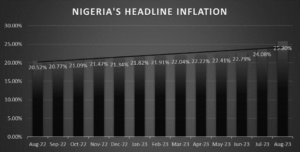 The percentage change in the average Consumer Price Index (CPI) for the twelve months ending in August 2023 compared to the preceding twelve months was 22.38%, reflecting a 5.31% rise compared to the 17.07% recorded in August 2022.