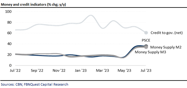 According to data from the Central Bank of Nigeria (CBN), private sector credit extension (PSCE) increased by 36% y/y to NGN54.2trn as at end-July ’23. The month’s growth rate slightly outpaced the 35% y/y growth it delivered in June ‘23. On a year-to-date (ytd) basis, PSCE grew by +23% ytd. The PSCE data reflects lending from all sources, including CBN and state-owned development banks, such as the Bank of industry, and smaller credit extensions by other banks, such as micro-finance and non-interest banks.