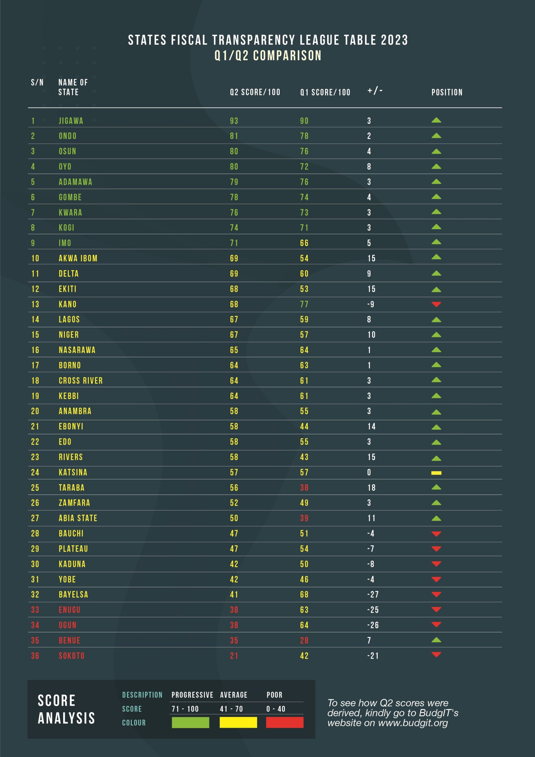 significant progress by adhering to the STFAS guidelines, 23 states exhibited moderate performance, and four states performed poorly. Compared to Q1 2023, Jigawa State secured the top position for the second time this year, Ondo State maintained its second place, while Osun State climbed to the third position, surpassing Kano State. Ogun State fell from 13th to 34th place on the league table because its website was down, denying citizens access to its fiscal repository. Sokoto State also moved from 33rd to the bottom of the league.