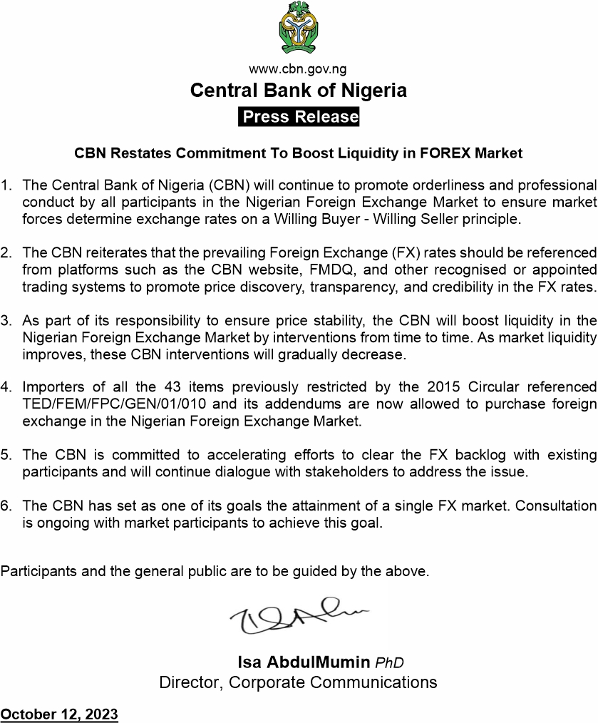 1. The Central Bank of Nigeria (CBN) will continue to promote orderliness and professional conduct by all participants in the Nigerian Foreign Exchange Market to ensure market forces determine exchange rates on a Willing Buyer – Willing Seller principle.