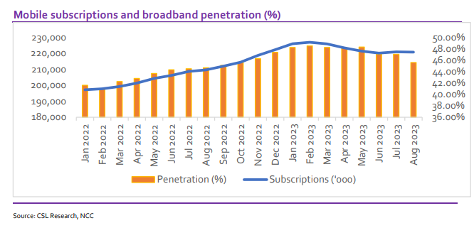 Based on new industry data from the Nigerian Communications Commission (NCC), Nigeria’s active mobile subscriptions decreased marginally by 0.07% to 220.71 million in August 2023 compared with 220.86 million in July 2023. This indicates that the country’s mobile subscriptions decreased by 145,026 in August. This decline follows a modest uptick in July following four consecutive declines; 0.5% in June, 1% in May and April, and 0.4% in March.