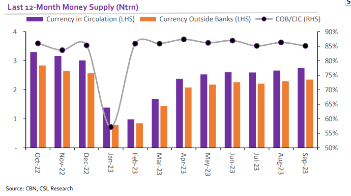 Money Supply statistics from the Central Bank of Nigeria (CBN) for September 2023 showed that currency in circulation (CIC) increased month-on-month by 3.8% in September to N2.76trn (highest this year) from N2.66trn as of August 2023. In same vein, currency outside banks (COB) rose month-on-month by 2.38% to N2.35trn (representing 85.1% of currency in circulation) as of September 2023 from N2.30trn (representing 86.3% of Currency in Circulation) in August 2023. Between January and September 2023, currency in circulation has risen by 99.17% (N1.37trn) while currency outside banks surged by 196.61% (N1.56trn). This, however, can be attributed to the reinjection of older Naira notes, which had been previously withdrawn from circulation by the CBN, back into the system.