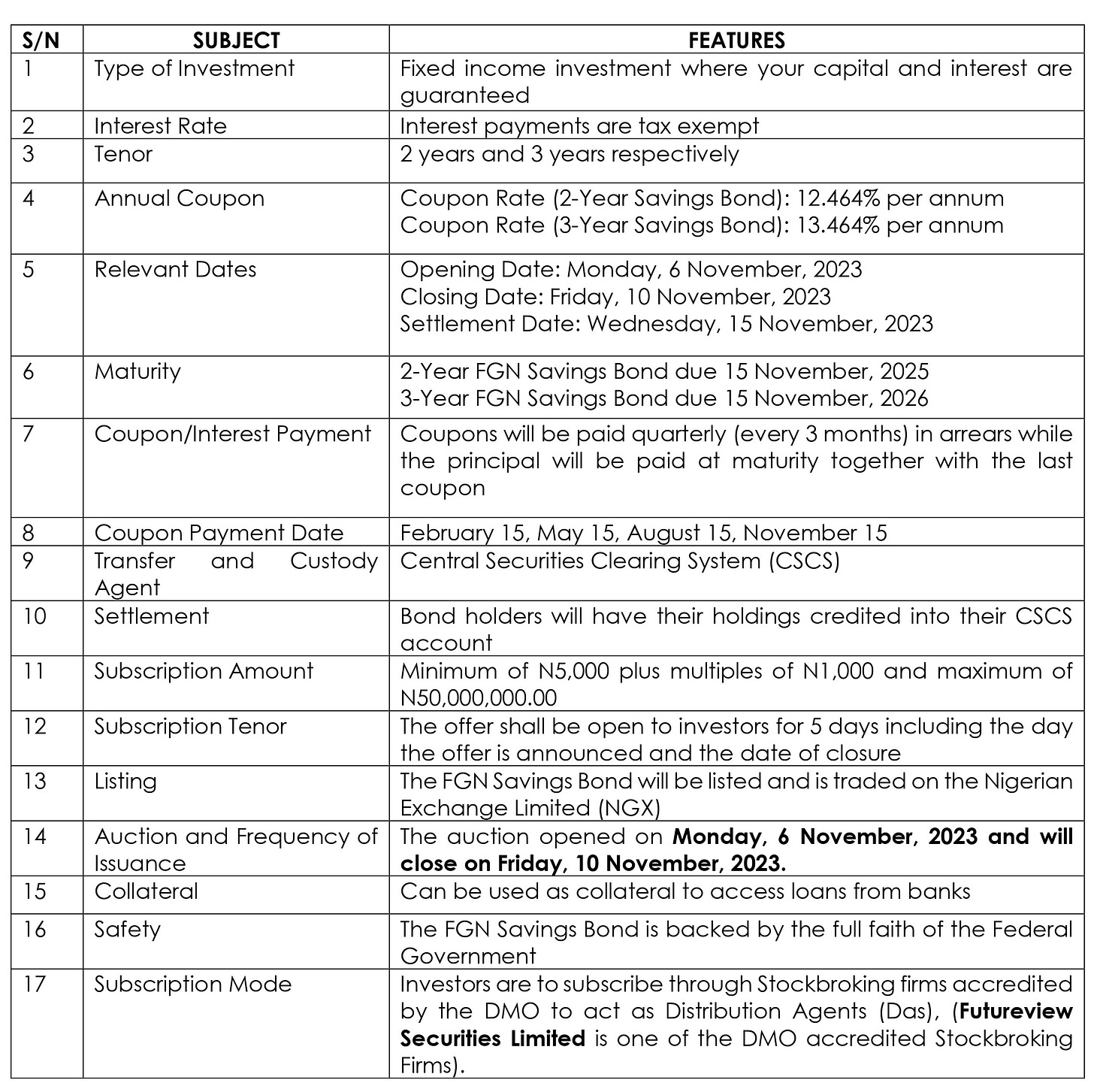 Kindly find below details of the monthly FGN Savings Bond which opened Monday, 6 November, 2023 and will close on Friday, 10 November, 2023.