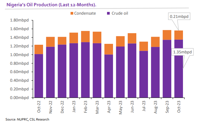 According to the latest monthly report from the Nigerian Upstream Petroleum Regulatory Commission (NUPRC), Nigeria’s average oil production (including condensates) marginally declined in October to 1.56mbpd. The report indicated that crude oil output (including condensates) declined by 0.7% from 1.57mbpd in September. The October production number is however up by 24.8% from the year low of 1.23mbpd in April. This implies that the country pumped a total of 48.4million barrels (including condensates) in the 31 days of October. September production number remains the highest this year.