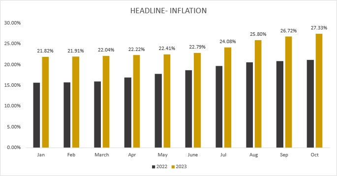 In the latest macroeconomic update for October 2023, the headline inflation rate demonstrated a significant upward trajectory, surging to 27.33%. This marked a distinct increase of 0.61% points compared to the preceding month, September 2023, when the rate stood at 26.72%. This monthly movement highlights a tangible acceleration in inflationary pressures. Delving into a year-on-year perspective, the headline inflation rate for October 2023 revealed a substantial 6.24% point elevation in contrast to the same month in 2022, where it recorded at 21.09%. This notable year-over-year increase underscores the persistence of inflationary trends, offering crucial insights into the evolving economic landscape.