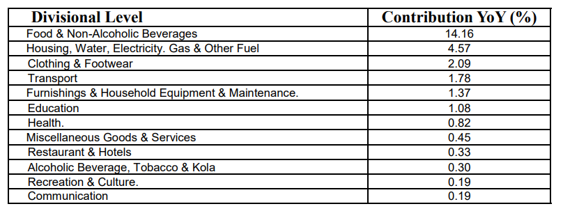 The contributions of items on the Divisional level to the increase in the Headline index on a Month-over-Month are presented thus: