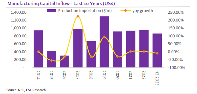 Based on the capital importation report from the National Bureau of Statistics (NBS) released in H1 2023, total capital inflow into country’s manufacturing sector jumped by 88.17% y/y in H1 2023 reaching US$861.16m from US$457.67m in H1 2022. Q/q, inflow into the sector increased by 136.2% to US$605.04m in Q2 2023 from US$256.1m in Q1 2022.