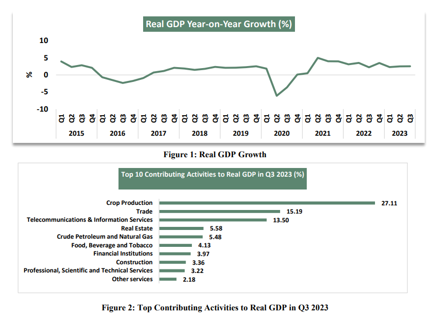 The non-oil sector grew by 2.75% in real terms during the reference quarter (Q3 2023). This rate was lower by 1.52% points compared to the rate recorded in the same quarter of 2022 and 0.84% points lower than the second quarter of 2023. This sector was driven in the third quarter of 2023 mainly by Information and Communication (Telecommunication); Financial and Insurance (Financial Institutions); Agriculture (Crop production); Trade; Construction; and Real Estate, accounting for positive GDP growth. In real terms, the non-oil sector contributed 94.52% to the nation’s GDP in the third quarter of 2023, higher than the share recorded in the third quarter of 2022 which was 94.34% and lower than the second quarter of 2023 recorded as 94.66%.