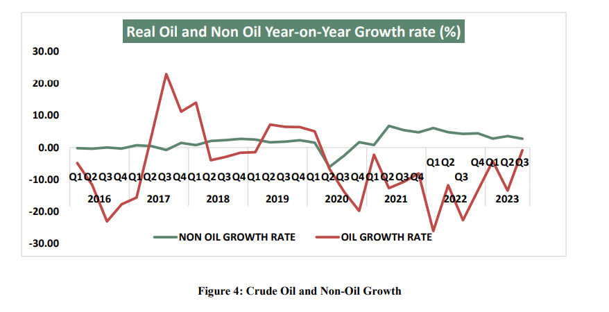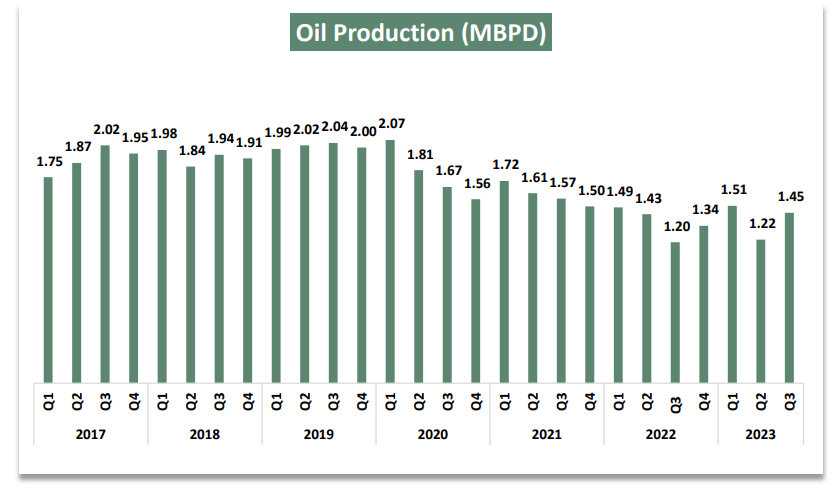 The nation in the third quarter of 2023 recorded an average daily oil production of 1.45 million barrels per day (mbpd), higher than the daily average production of 1.20mbpd recorded in the same quarter of 2022 by 0.25mbpd and higher than the second quarter of 2023 production volume of 1.22 mbpd by 0.23mbpd. (Figure 3).