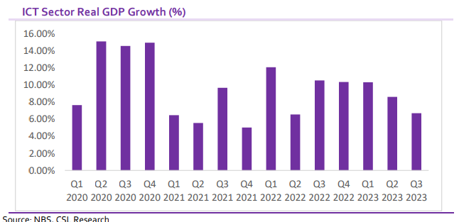 Based on data from the National Bureau of Statistics (NBS), the Information and Communications Technology (ICT) sector’s growth rate declined to a five year low of 6.69% y/y in Q3 2023 compared with 10.53% recorded in Q3 2022 and 8.60% recorded in Q2 2023. The sector contributed 15.97% to Nigeria’s total GDP, higher than 15.35% in Q3 2022 but significantly lower than the 19.54% contribution in Q2 2023. The ICT sector comprises of telecommunications and information services, publishing, motion picture, sound recording, music production, and broadcasting.