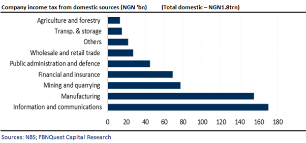 CIT revenue from the manufacturing sector ranked second at NGN155.7bn, representing c.24% of domestic CIT collections and c.9% of total CIT receipts.