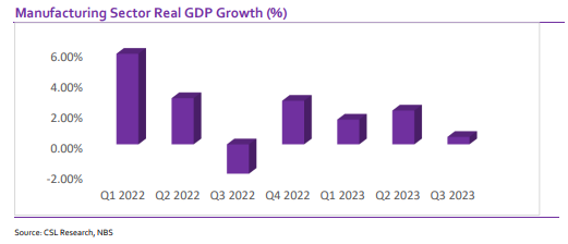 Though at a slower pace, the CBN has maintained its hawkish stance in 2023 and the fortunes of the manufacturing sector have worsened with the latest reforms of the new administration such as the fuel subsidy removal and the unification of the exchange rates at the various windows. The sector’s growth rate improved slightly to 2.2% in Q2 2023 compared with 1.61% in Q1 2023 but declined steeply in Q3 to 0.48% following the reforms. Players in the sector saw significant increases in net foreign exchange loss because of the Naira devaluation in June 2023. Manufacturers have tried to pass on the associated increase in cost of production to consumers, but this affected volumes, particularly for non-essentials due to the constrained purchasing power of consumers.