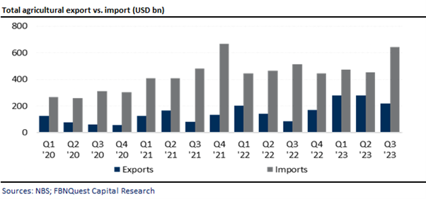 With respect to imports, the value of agricultural products increased by 42% q/q and 25% y/y to NGN643.7bn.