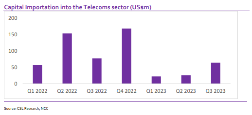 The National Bureau of Statistics (NBS) capital importation data showed the telecoms sector attracted investments worth US$65.05m in Q3 2023 compared to US$77.26m in Q3 2022, a significant decline of 17.10% y/y. Quarter on quarter, foreign capital inflow into the telecoms sector increased by 148.16% in Q3 2023 when compared with US$25.81 million recorded by the sector in Q2 2023. The NBS data also revealed that the telecoms sector accounted for 9.78% of the total capital inflow into the economy in Q3. We note that Nigeria’s total capital importation into Nigeria in Q3 2023 was US$654.65 million, lower than US$1.16 billion recorded in Q3 2022. On a q/q basis, capital importation declined by 36.45% from US$1.03 billion in Q2 2023.
