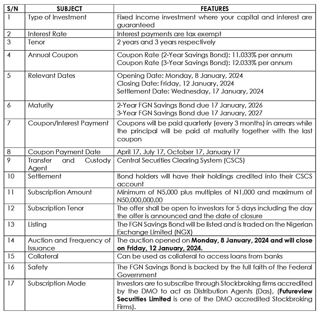 Investors Bite, UpdatesInvestment Opportunity in FGN Savings Bond – January 2024 Offer for Subscription Opens Posted by InvestAdvocate on January 9, 2024 More in Investors Bite: Nigerian Bourse Close Bullish +0.3% on Bellwether Gains April 8, 2026 NGXASI Advance +0.28% on Gain in FIRSTHOLDCO, GTCO, SEPLAT April 8, 2026 NGX Extends Gains as Buying Interest Lifts Market April 8, 2026Image Credit: DMOJanuary 8, 2023/Futureview ResearchKindly find below details of the monthly FGN Savings Bond which opened Monday, 8 January, 2024 and will close on Friday, 12 January, 2024.FEATURES OF THE FGN SAVINGS BOND (JANUARY 2024 OFFER)Share this:Click to share on Facebook (Opens in new window)Click to share on Twitter (Opens in new window)Click to email a link to a friend (Opens in new window)Click to print (Opens in new window)