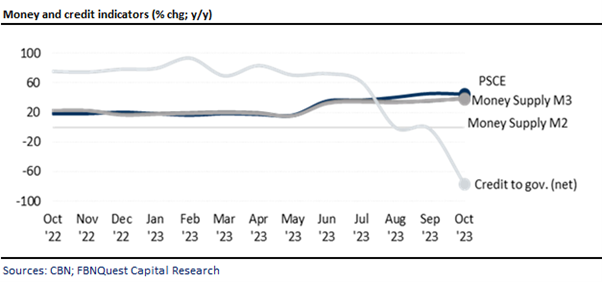 According to the most recent data from the Central Bank of Nigeria (CBN), private sector credit extension (PSCE) increased significantly by 44% y/y to NGN59.7trn as at Nov ’23. PSCE also expanded by 43% over the eleven-month period to Nov ’23. The data covers lending by the entire banking system and not only the deposit money banks (DMBs), which accounts for 69% of the total figure. Specifically, the data reflects lending by the CBN and state-owned development banks, such as the Bank of Industry, and smaller credit extension by other banks, including micro-finance banks and non-interest banks.