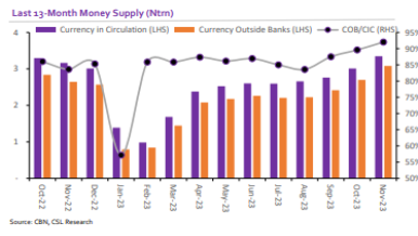 Between January and November 2023, currency in circulation (CIC) has risen by 141.47% (N1.96trn) and this can be attributed to the reinjection of older Naira notes into the system, which had been previously withdrawn from circulation by the CBN. In the same period, currency outside banks (COB) has surged by 288.96% (N2.29trn) on the back of rising non-bank held cash, amidst growing public concern over the sufficiency of currency in the banking system.