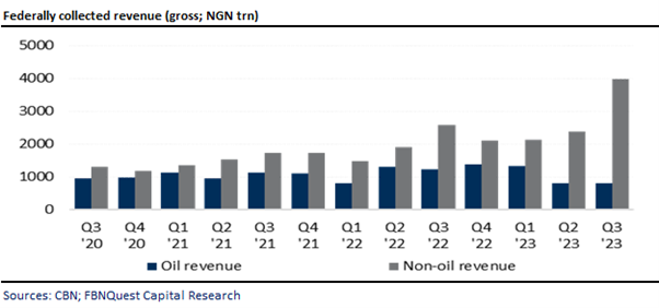 The slight q/q rise in oil revenue was driven by higher collections from production sharing contracts (PSC) and the 2023 interim dividend payments by NNPC Ltd.