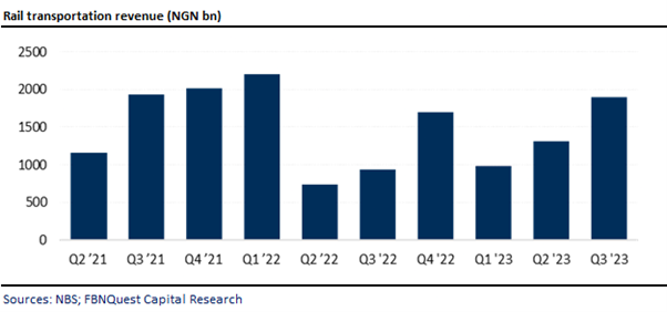 According to the most recent report from the National Bureau of Statistics (NBS) on railway transportation, the total revenue generated from railway traffic increased by +45% q/q to NGN1.9bn in Q3 ’23. On a y/y basis, the sub-sector’s revenue growth more than doubled. It is worth mentioning that the total revenue figure comprises income generated from passenger fees, freight, and other sources.