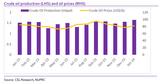 According to data from the National Upstream Petroleum Regulatory Commission (NUPRC), Nigeria’s crude oil production including condensates, increased 5.85% m/m reaching 1.64 million barrels per day (mbpd) in January 2024, up from 1.55 mbpd in December 2023. Excluding condensates, the production rose to 1.43 mbpd, compared with 1.34 mbpd in the previous month. In 2023, the average crude oil production was 1.47 mbpd, slightly below our projected 1.48 mbpd. Persistent challenges such as pipeline vandalism, theft, and terminal shutdowns, hampered the growth of crude oil production throughout 2023. These production figures fell short of the government’s expectations of 1.69 mbpd in 2023.