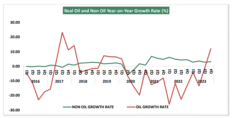 The non-oil sector grew by 3.07% in real terms during the reference quarter (Q4 2023). This rate was lower by 1.37% points compared to the rate recorded in the same quarter of 2022 and 0.32% points higher than the third quarter of 2023. This sector was driven in the fourth quarter of 2023 mainly by Financial and Insurance (Financial Institutions); Information and Communication (Telecommunication); Agriculture (Crop production); Trade; Construction; Manufacturing (Food, Beverage, and Tobacco) and Real Estate, accounting for positive GDP growth. On an annual basis, the non-oil sector growth in 2023 stood at 3.04% relative to 4.84% recorded in 2022.