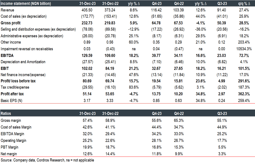 Gross margin weakened by 150bps to 57.4% in 2023FY, as the cost of sales ex-depreciation grew by 12.6% y/y, owing to higher cost of fuel and power (+21.6% y/y), production (+20.4% y/y) and maintenance (+21.8% y/y). The cost pressure was driven by the high inflationary environment and naira depreciation effect on the company’s FX-linked gas contracts.