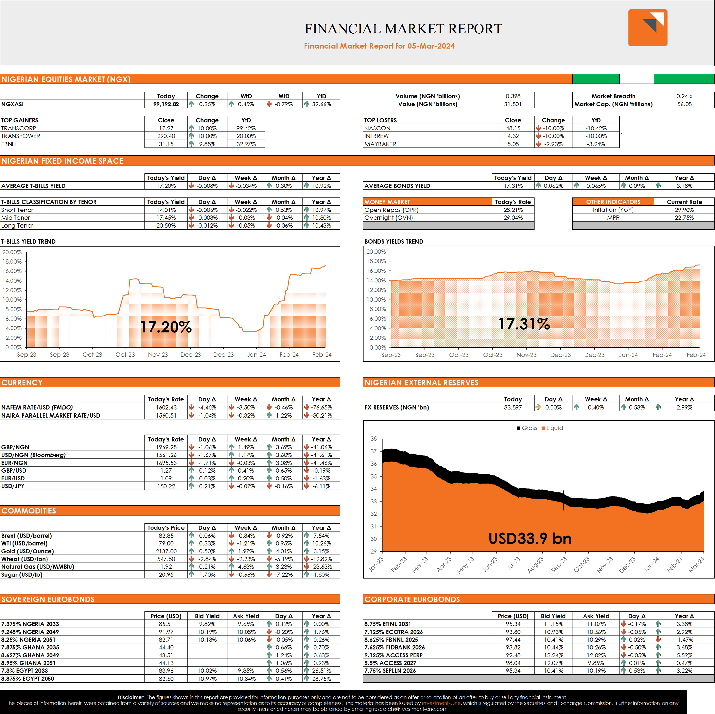 At the NAFEM window, the Naira depreciated by 4.45% to close at NGN 1,602.43/USD. Crude oil price (Brent) increased by 0.06% to USD82.85pb.