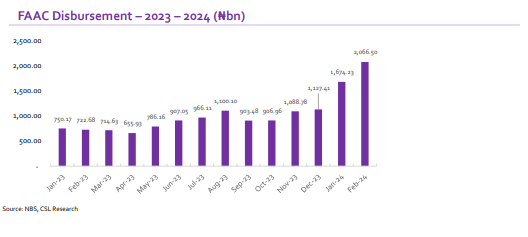 According to the Nigerian Bureau of Statistics (NBS), the Federal Account Allocation Committee (FAAC) distributed N2.07tn in February 2024 from the total revenue collected in January 2024 among the Federal Government, States, and Local Government Councils. The total amount distributed in February 2024 came in 23.4% m/m higher than the N1.67tn distributed in January 2024.