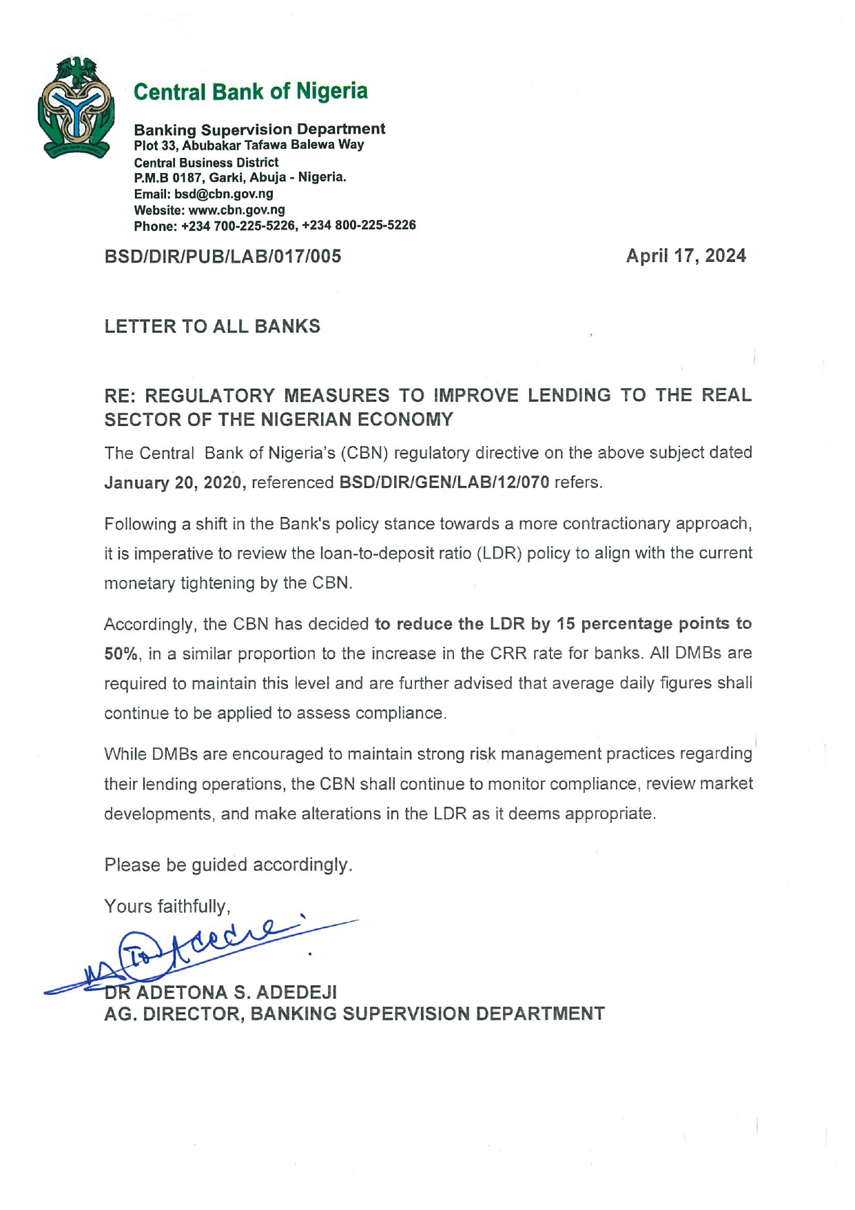 In a letter to all Deposit Money Banks (DMBs) signed by Dr Adetona Adedeji, Ag Director, Banking Supervision Department, Central Bank of Nigeria, the regulator advised the DMBs to maintain the current level of LDR. The CBN also stated that average daily figures will continue to be used to assess compliance.