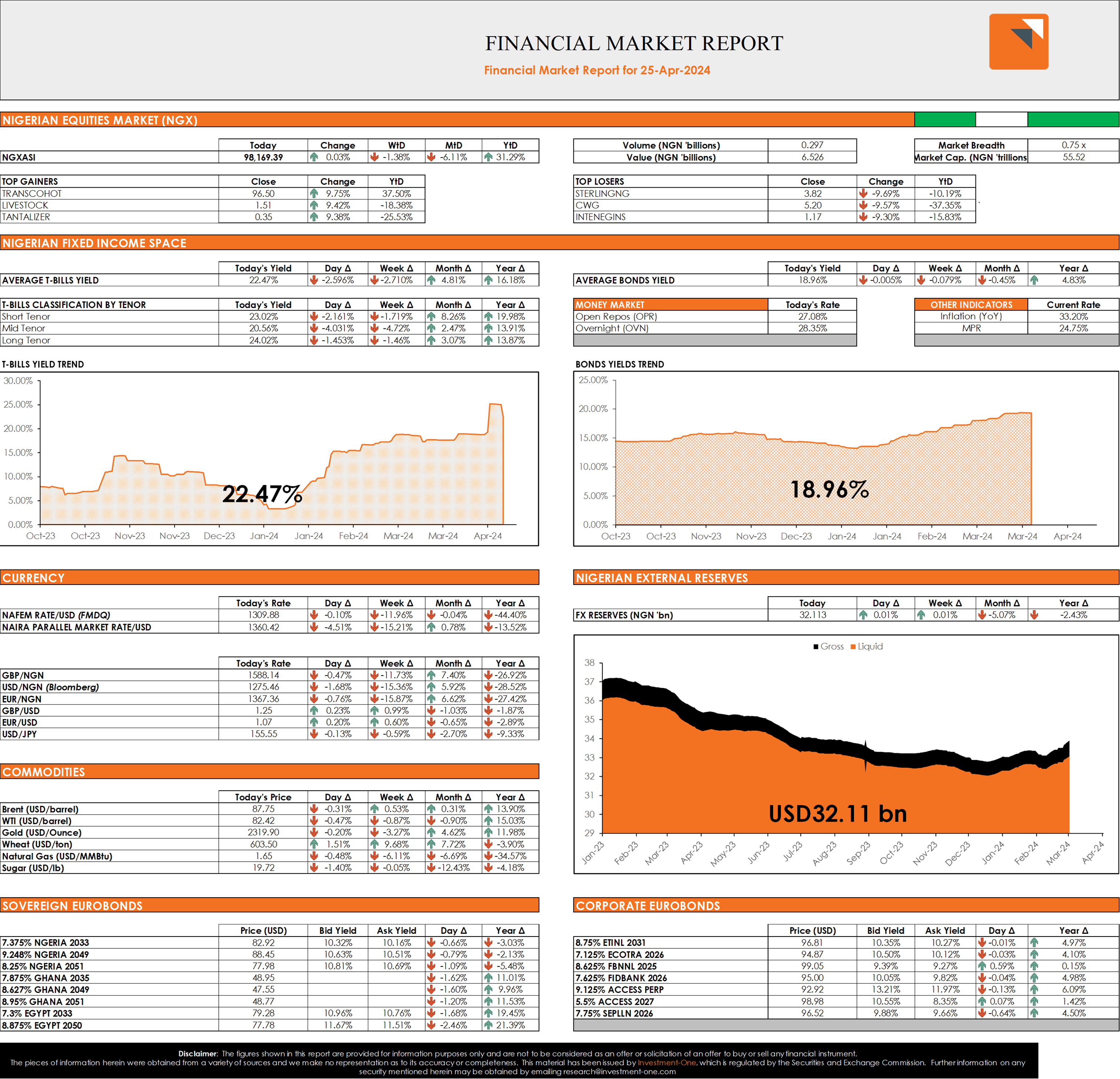 In the fixed income space, the Treasury Bills secondary market closed bullish, majorly due to buy pressure across the curve. Consequently, Average T-Bills yield fell by 260bps to close at 22.47%. However, the FGN Bond market traded on a relatively quiet note, as the Average FGN Bond yield slightly declined by 1bp to close at 18.96%.