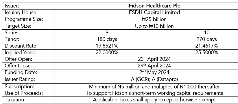 FSDH Capital Limited is pleased to inform you that the Series 9 & 10 Commercial Paper Issuance (“CP”) of Fidson Healthcare Plc (“Fidson” or “the Issuer” or “the Company”) of up to ₦10 billion under its ₦25 billion Commercial Paper Programme (“the Programme”) is STILL OPEN and scheduled to close on Monday, 29th April 2024. Fidson is one of the leading pharmaceutical manufacturing companies in Nigeria. The Company is engaged in the manufacturing, marketing, and sales of pharmaceutical and healthcare products in Nigeria and West Africa. Fidson currently has over 250 duly registered pharmaceutical brands, across different therapeutic areas, in the Nigerian market. For the year ended 2023, the Company recorded ₦53.1 billion in sales, a 31% increase over ₦40.6 billion recorded in the previous year. Fidson has a wide range of over 150 high-quality, unique and innovative products that cover therapeutic areas ranging from infectious diseases, cardiovascular diseases, antimalarials, antiretrovirals, psychiatry, nutrition, nutraceuticals, antitussives etc. About 60% of these are made locally and the balance is imported. Fidson has previously accessed funding through the Capital markets, having issued a ₦5 Billion 210 & 270-day Commercial paper in December 2023, ₦5 Billion 181 & 269-day Commercial paper in November 2023, ₦5 Billion 269- day Commercial paper in March 2023, ₦3 Billion 270- day Commercial paper in June 2022, ₦2.15 Billion 90-day Commercial Paper in December 2021, ₦4.5 Billion 270-day Commercial Paper in March 2021, a ₦2.3 Billion Rights Issue in July 2019, and a ₦2.0 Billion five-year Secured Fixed Rate Corporate Bond in November 2014. Key Financial Highlights |