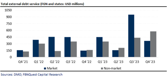 Discussing Nigeria’s debt profile and focusing on the Debt Management Office’s (DMO) external debt service data shows that the federal government of Nigeria’s (FGN’ s) total external debt obligations fell by US$447.5m (-32% q/q) to US$943.2m in Q4 ’23. The total debt service cost comprises market-related debt service payments of US$364m and non-market-related debt service payments of US$579m.