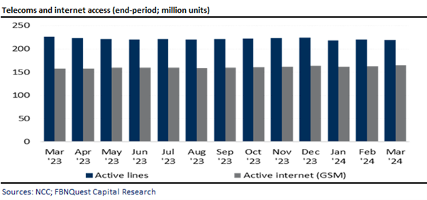 - The m/m reduction in active mobile lines was mainly caused by 9Mobile, with significant attrition of about 2 million or (-15% m/m) in March, taking its subscriber base to 11.7 million as of end-Mar ’24.