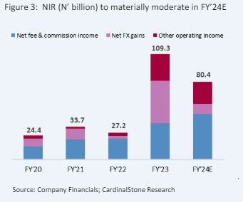 Meanwhile, based on CBN’s directive for the Net Open Position (NOP) limit, we estimate a moderation in FX revaluation gain. In Q1 2024, the bank recorded N3.3bn in revaluation gains, likely linked to the unwinding of its FY 2023 NOP of N16.8bn. Over the coming quarters, we forecast a significant decline in income from FX movements and project a lower unadjusted NIR.