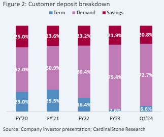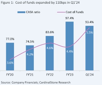 In FY 2024, management plans to maximise its net interest margin (NIM) by optimally pricing its credit assets in line with the interest rate environment and reducing its cost of funds. However, due to increased pressure from funding sources, we expect NIM to rise slightly in FY 2024. This view is consistent with the 4ppts contraction in the CASA ratio in Q1 2024, which was linked to the 3x surge in term deposits (6.6% of deposits). Therefore, given the 750bps increase in MPR to 26.25%, we see scope for a limited expansion in NIMs in the current financial year (+20bps to 8.3%, consistent with management’s guidance of 8.0% – 8.5%).