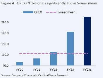 Given the mentioned increase in the bank’s assets, we see latitude for sustained pressures from regulatory charges over the current full year. Hence, we project a 39.1% rise in OPEX and a 55.0% CIR in FY 2024 (vs 50.4% in FY 2023). This CIR projection remains within management’s guidance of below 65.0%. With the anticipated moderation of unadjusted NIR, we expect operating income to grow by 27.5% to N492.9bn (vs the stronger increase in OPEX), thereby pushing the cost-to-income ratio higher.