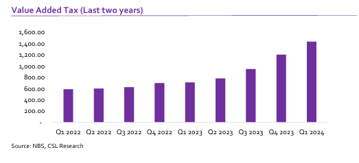 Value Added Tax (VAT) surged by 101.7% year-on-year to N1.43trn in Q1 2024, up from N709.59bn in Q1 2023, according to the National Bureau of Statistics (NBS). On a quarterly basis, VAT increased by 19.2% from N1.20trn in Q4 2023. The VAT rate, set at 7.5% since its increase from 5% in February 2020, is charged on all goods and services produced within or imported into the country. The persistent inflation has driven up the price levels of goods and services, contributing to the growth of VAT revenues during this period. Several factors, including rising import duties, the removal of fuel subsidies, and the depreciation of the Naira, have led to higher prices for goods and services.