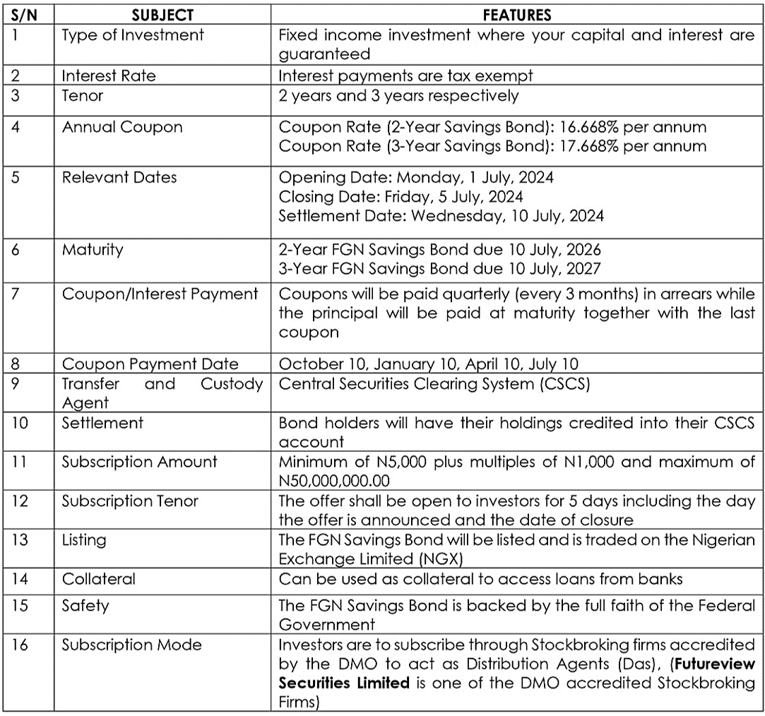 Kindly find below details of the monthly FGN Savings Bond which opened Monday, 1 July, 2024 and will close on Friday, 5 July, 2024.
