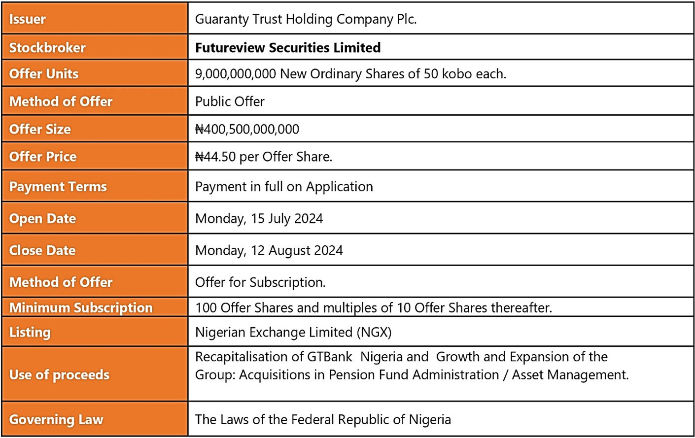 Futureview Securities Limited is pleased to inform you of Guaranty Trust Holding Company Plc’s (“GTCO” or the “Company”) Offer for Subscription of 9 billion ordinary shares to the general investing public at a fixed price of ₦44.50 per share (the “Offer”). The Offer opened on 15 July 2024, and will close on Monday, 12 August 2024.