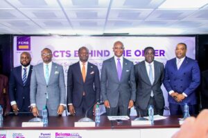 L – R Chief Executive Officer, NGX Regulation Limited (NGX RegCo), Mr. Olufemi Shobanjo; Chief Executive Officer, Nigerian Exchange Limited (NGX), Mr. Jude Chiemeka; Group Managing Director/CEO, NGX Group, Mr. Temi Popoola; Group Chief Executive Officer, FCMB Group, Mr. Ladi Balogun; Executive Director, Coverage and Investment, FCMB Group, Mr Femi Badejo and Executive Director/Group Chief Operating Officer, FCMB Group, Mr. Gbolahan Joshua during FCMB Group Facts Behind the Offer Presentation at NGX on Tuesday in Lagos. Image Credit: NGX