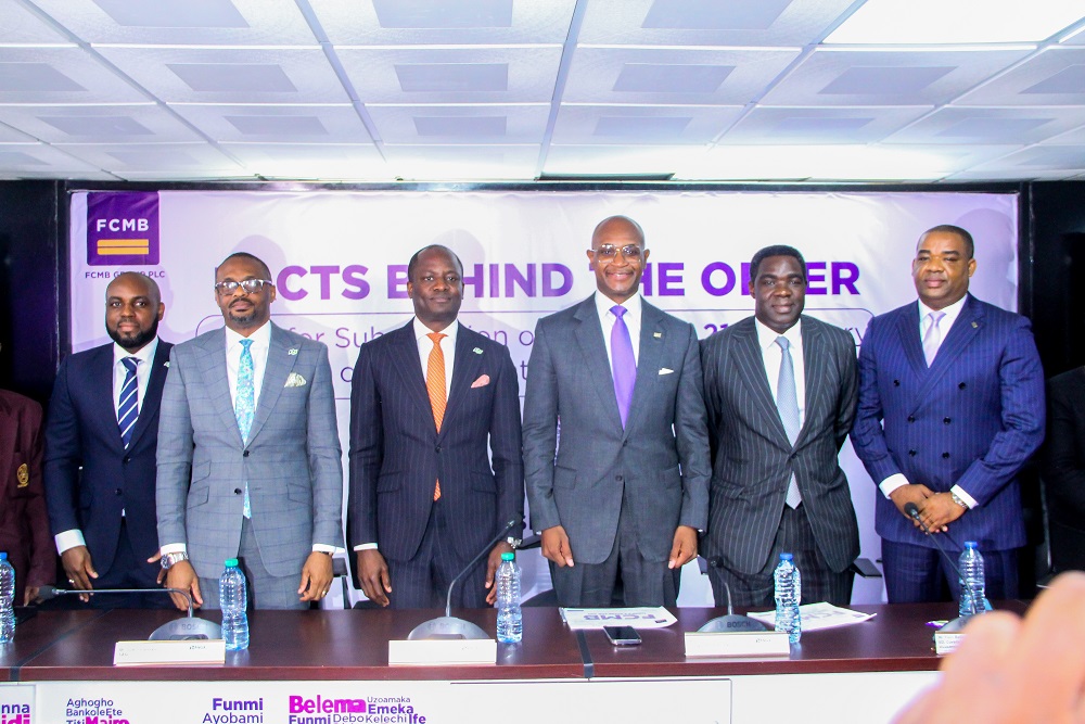L – R Chief Executive Officer, NGX Regulation Limited (NGX RegCo), Mr. Olufemi Shobanjo; Chief Executive Officer, Nigerian Exchange Limited (NGX), Mr. Jude Chiemeka; Group Managing Director/CEO, NGX Group, Mr. Temi Popoola; Group Chief Executive Officer, FCMB Group, Mr. Ladi Balogun; Executive Director, Coverage and Investment, FCMB Group, Mr Femi Badejo and Executive Director/Group Chief Operating Officer, FCMB Group, Mr. Gbolahan Joshua during FCMB Group Facts Behind the Offer Presentation at NGX on Tuesday in Lagos. Image Credit: NGX